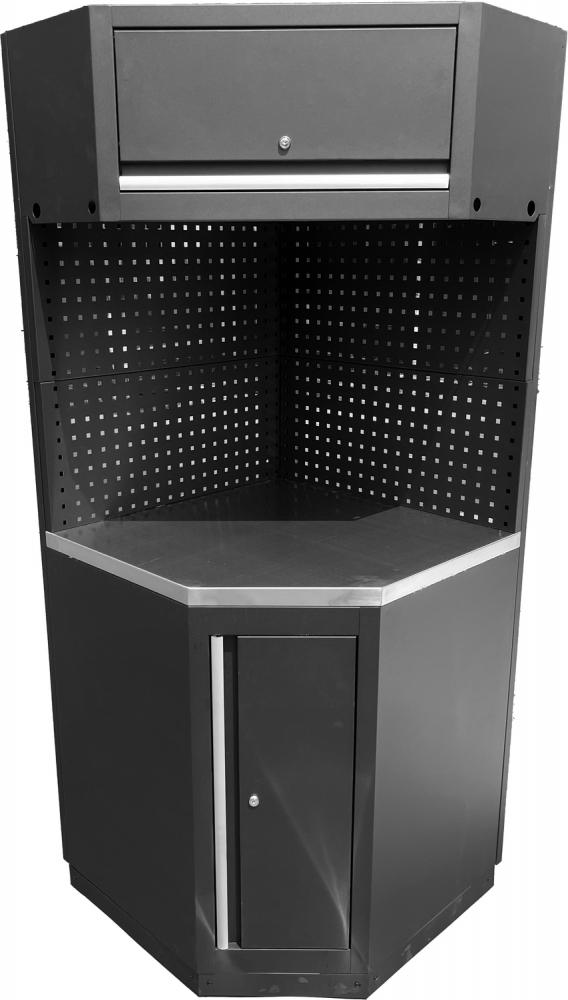 Darbnīcas skapju sistēmas iekšējā stūra modulis, nerūsošā tērauda darba virsma