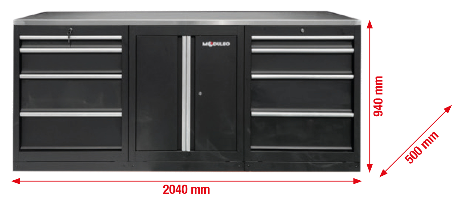 - Apakšējais skapītis ar 4 atvilktnēm (1x 75 mm, 1x 150 mm, 2x 230 mm)