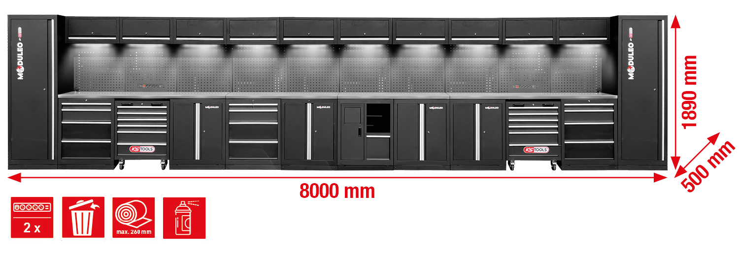 Darbnīcas skapju sistēma, taisna, 8000 x 500 mm, 1. variants
