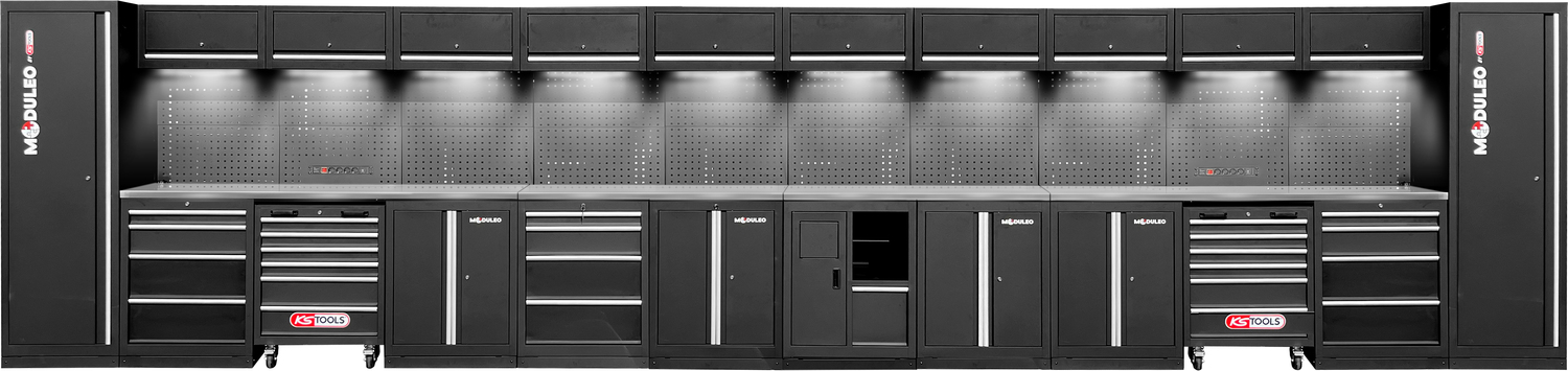 - 2 x iekļauti darbnīcas ratiņi ar 6 atvilktnēm (4x 75 mm, 2x 150 mm)