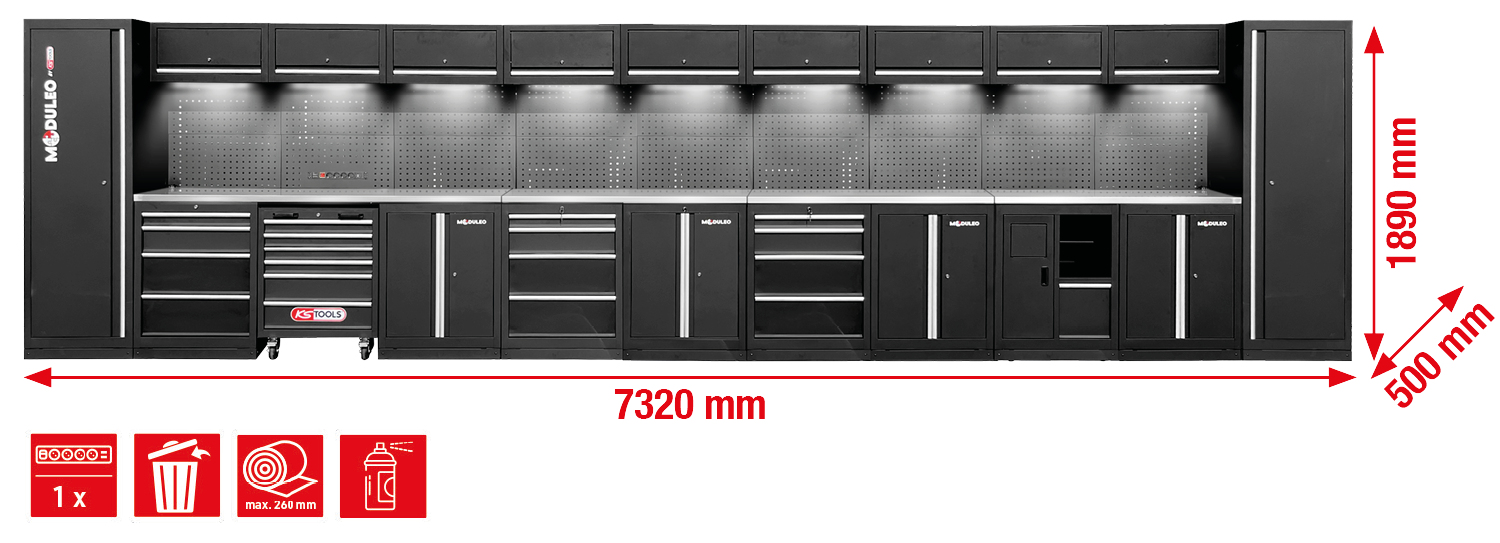 Darbnīcas skapju sistēma, taisna, 7320 x 500 mm, 1. variants