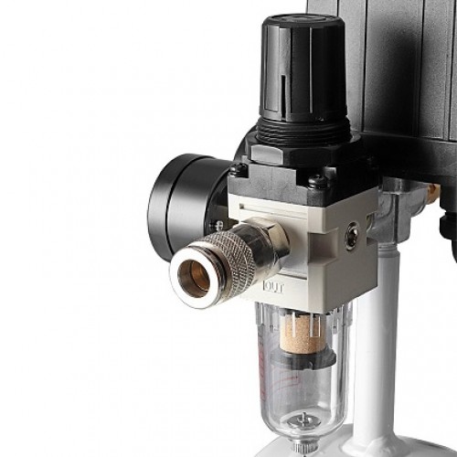Kondensāta atdalītājs - integrētais ūdens separators ar spiediena regulatoru ir pastāvīgi uzstādīts uz kompresora un ļauj regulēt izejas gaisa spiedienu.
