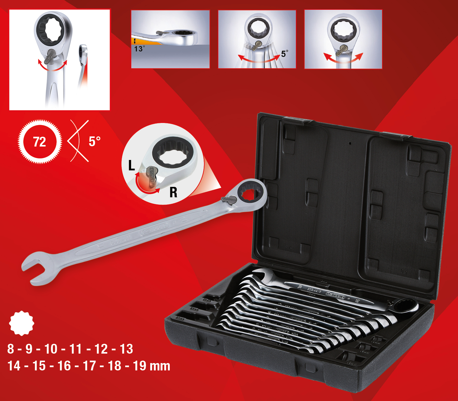 GEARplus kombinēto sprūdratu atslēgu komplekts, pārslēdzamas, 12-daļīgs
