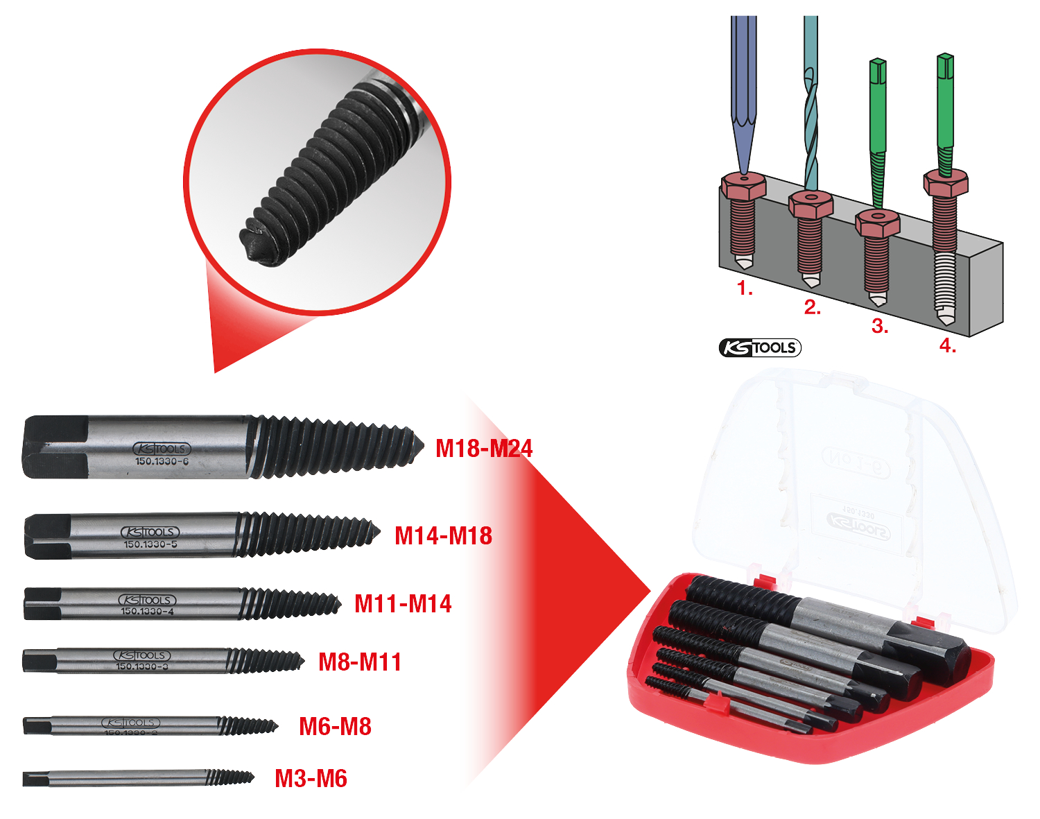- leidžia išsukti nutrauktus varžtus ir pirštus