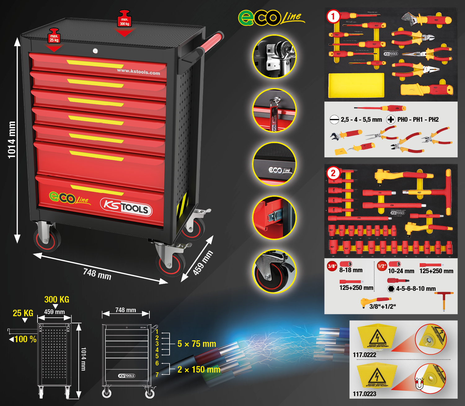 ECOline darbnīcas ratiņi ar 42 izolētiem instrumentiem hibrīda un elektriskajiem transportlīdzekļiem