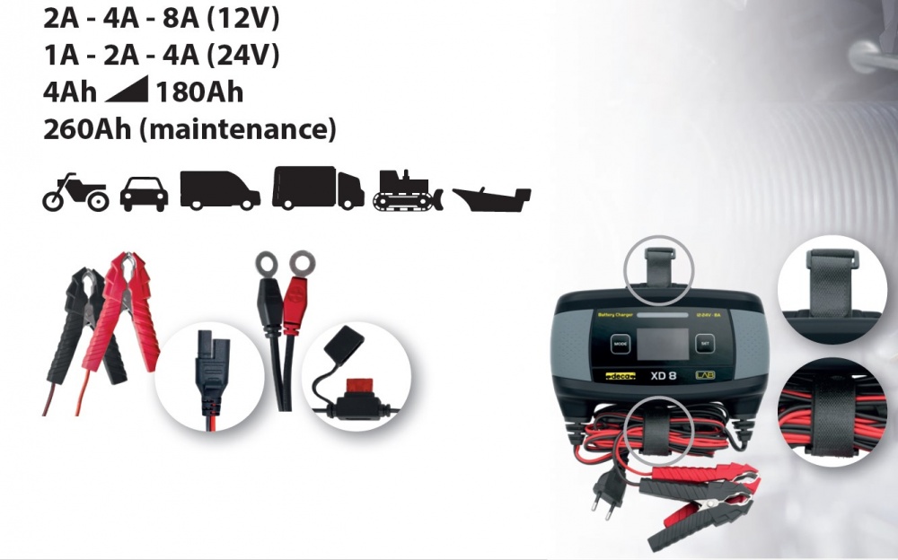 XD linijos daugiafunkciniai akumuliatorių krovikliai ir palaikytojai yra naujausias sprendimas, esantis automobilių rinkoje dabar, įkrovimo valdymo ir automobilių akumuliatorių priežiūros srityje, papildytas akumuliatoriaus ir generatoriaus tikrinimo funkcijomis. Kompaktiški, ergonomiški, funkciniai ir patogūs naudoti, jie pagrindinai skirti vartotojams, ieškantiems daugiafunkcinių aukštos kokybės produktų.