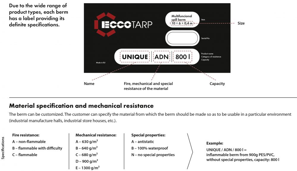 Susilankstytos nutekėjimų konteinerio apsaugos UNIQUE pagamintos iš tvirto pramoninio tekstilės su ypatingu paviršiaus apdaila, turinčios skirtingą ugnies ir mechaninį atsparumą. Išorinės sienos atramos aplink visas barjero perimetrą yra įmontuotos specialų „Quick-Lock“ ir pagamintos iš tvirto nerūdijančio plieno (arba cinkuoto plieno). Jos sudarytos iš išimtinos stabilizacijos dalies (standaus varianto ir / ar susilankstomosios versijos) bei dalies, kuri yra integrali viršutiniam barjero kraštui ir įmontuota aukščiau minėto paprasto „Quick-Lock“, į kurį atrama lengvai prisitvirtina. Dėka šio principo, barjeras greitai surenkamas vos dviem žingsniais - išskleidžiant tinką ir tvirtinant sienos atramas.