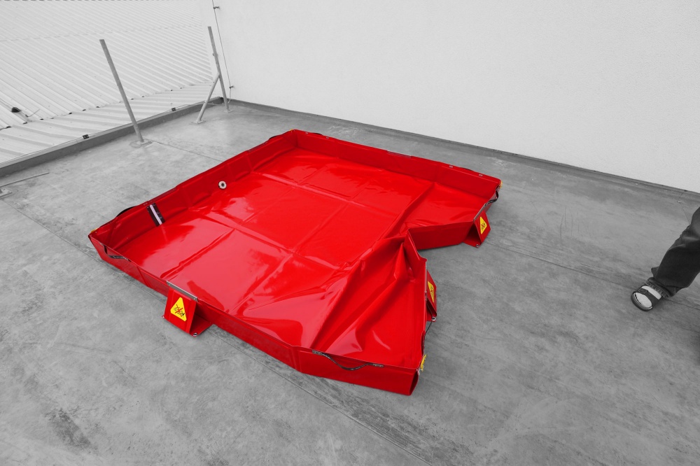 Susilankstanti išsiliejimo DECON platforma yra savarankiška, pagaminta iš storos audinio su apsauginiu sluoksniu (PES/PVC 680 g/m²). Medžiaga atspari dekontaminacijos chemikalams, alyvoms ir rūgštims (žr. cheminių medžiagų atsparumo sertifikatą). Stabilumą užtikrina papildytos šoninės atramos. Šoninės rankenėlės pritvirtintos norint palengvinti naudojimą. Dekontaminacijos platforma aprūpinta išteklų skyle D25 su dangčiu, leidžiančiu nutekėti platformą be panardinamojo siurblio. Dėka to, platforma gali būti naudojama tiek dekontaminacijai, tiek kaip standartinė išsiliejimo platforma, jei reikia.