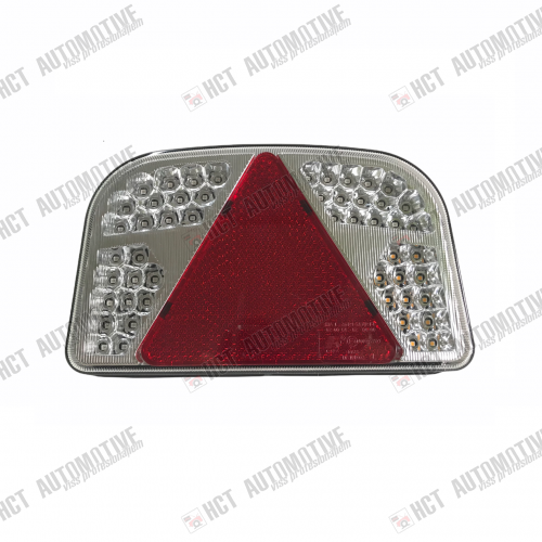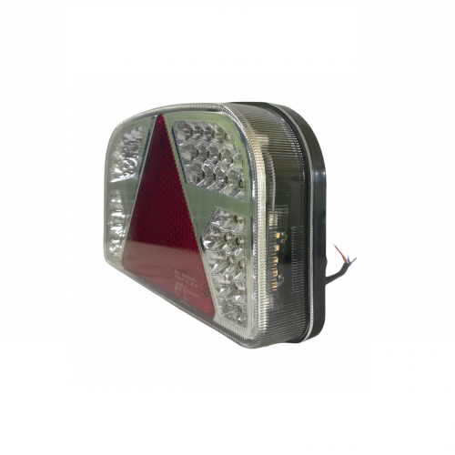 Aizmugurējais kreisais 12V LED lukturis. Izmēri 244x148x48 mm, attālums starp stiprinājuma vietām 150 mm. Lukturim ir 7 funkcijas:aizmugurējie gabarīti, bremzes, atpakaļgaita, migla, pagrieziens, numura apgaismojums un atstarotājs.Lukturim ir E marķējums. Lukturis ir ar 1,4 m 6 dzīslu vadu: zilais - migla, pelēkais - atpakaļgaita, sarkanais - bremzes, melnais - numura apgaismojums, dzeltenais - pagrieziens, baltais - masa.