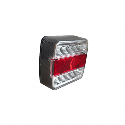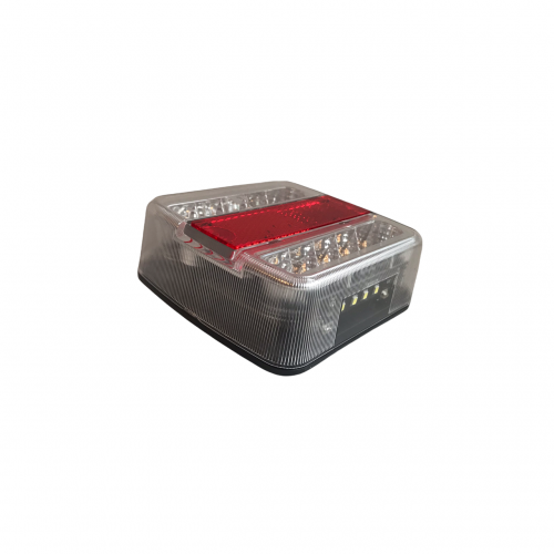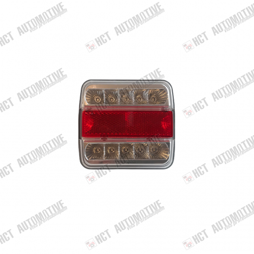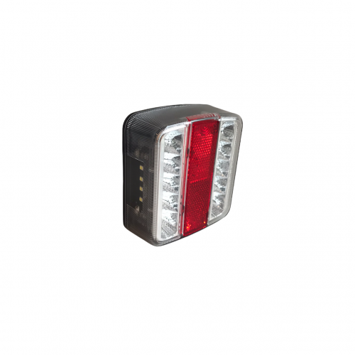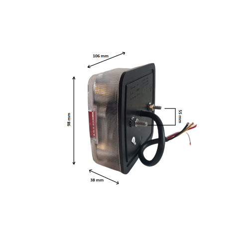 Universāls aizmugurējais 12V LED lukturis. Izmēri 106x98x38 mm, attālums starp stiprinājuma vietām 55 mm. Lukturim ir 4 funkcijas: aizmugurējie gabarīti, bremzes, pagrieziens un numura apgaismojums. Lukturim ir E marķējums. To var uzstādīt gan horizontāli, gan vertikāli atkarībā no numura zīmes atrašanās vietas.