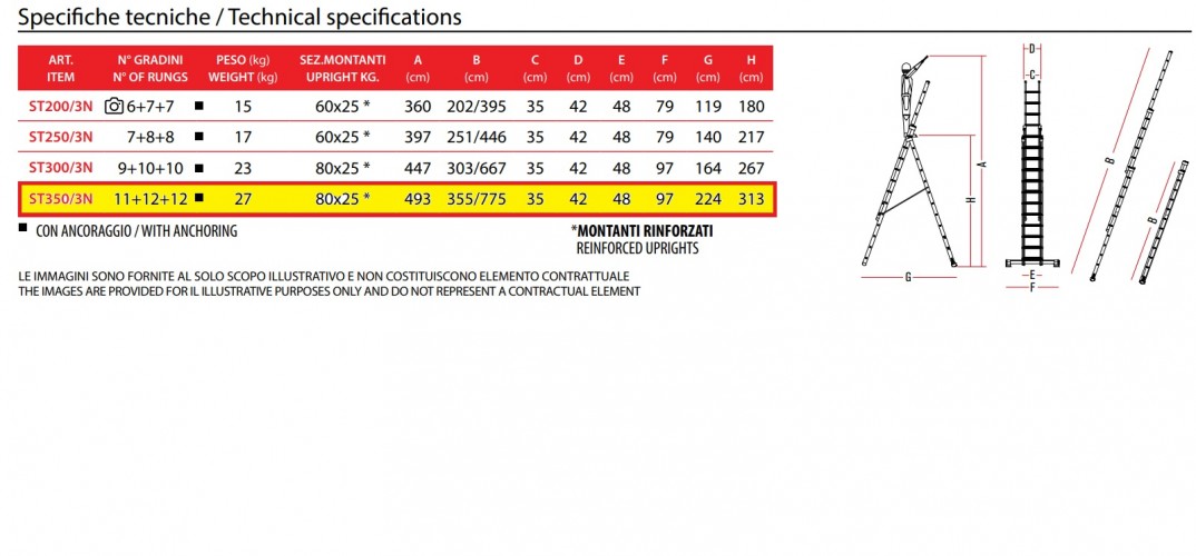 Maximum length 775cm Minimum length 355cm Grades 11+12+12 Weight 27 kg Width 35/42/48cm Support foot width 97cm The maximum weight on the stairs is 150 kg Made in Italy