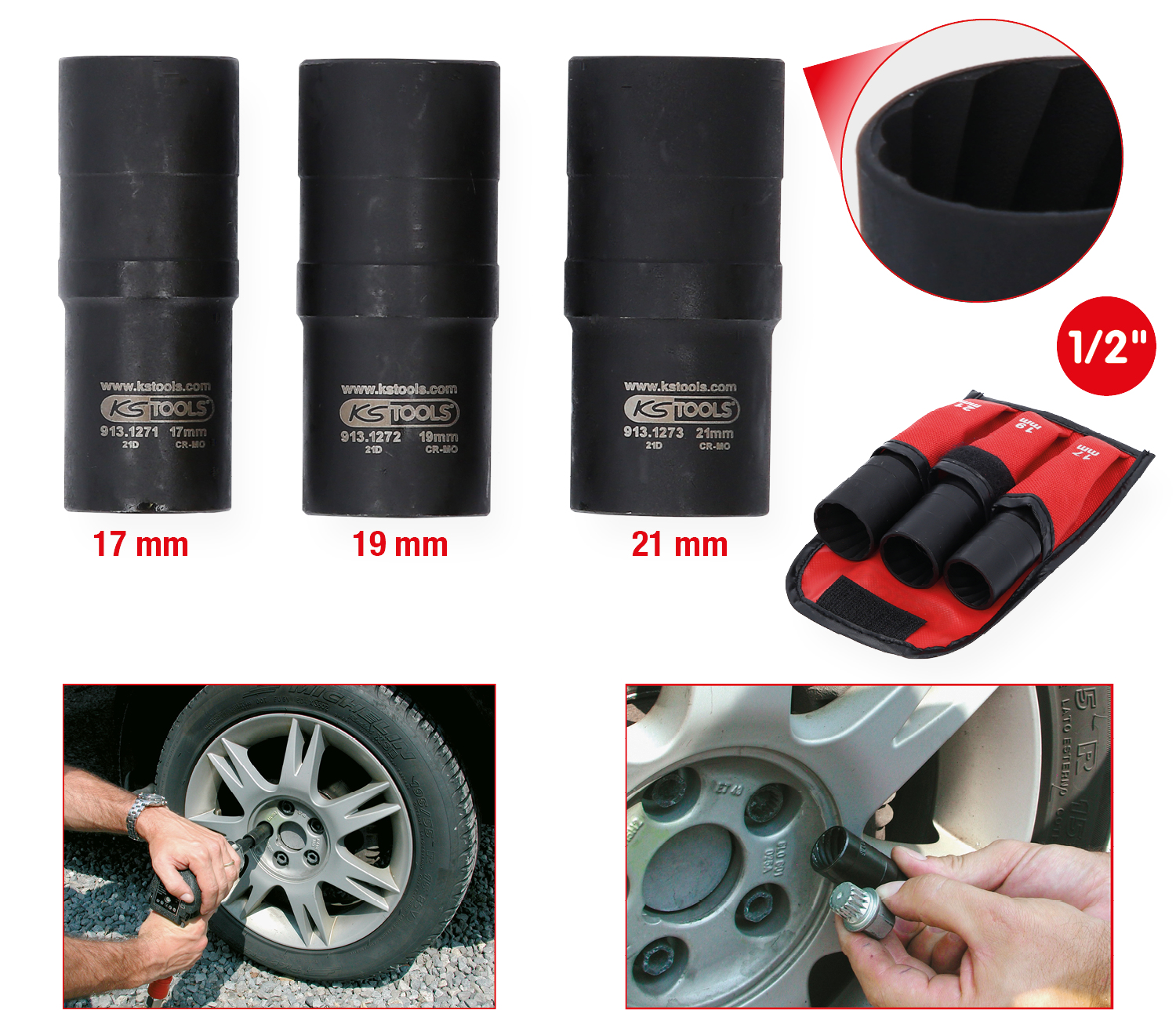 Комплект силовых торцовых головок со спиральным профилем 1/2", 3 шт, 17-21 мм
