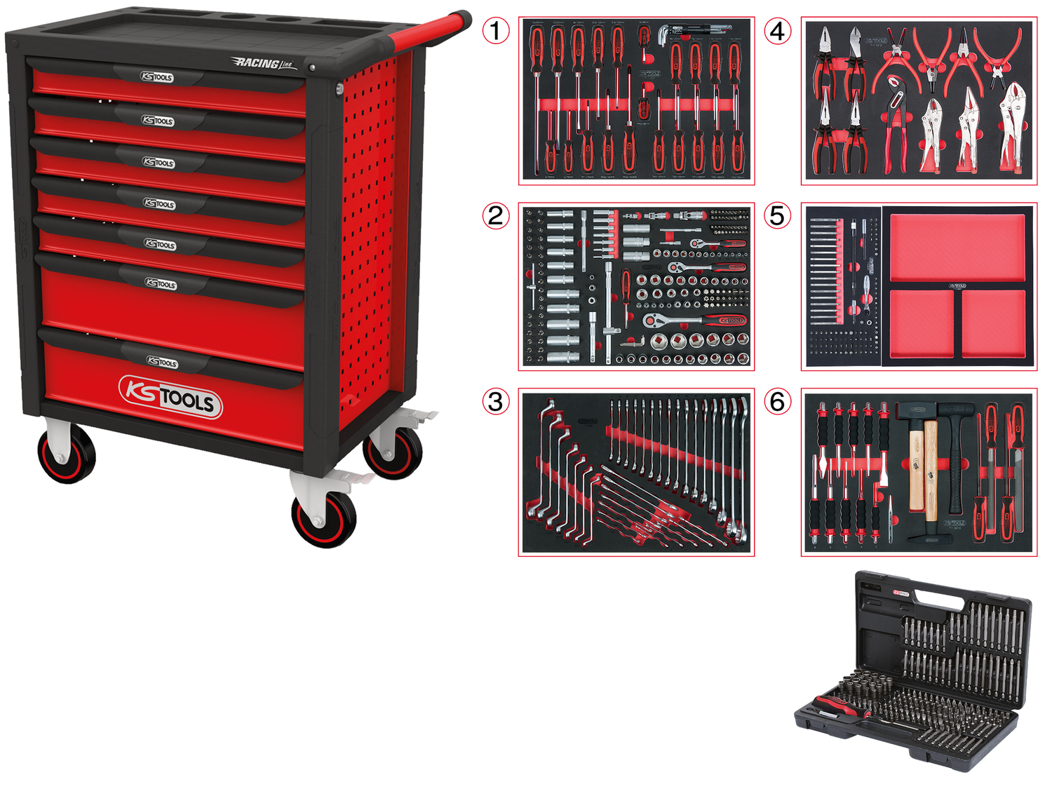 RACINGline черно-красная инструментальная тележка с 7 ящиками и комплектом из 598 инструментов премиум-класса