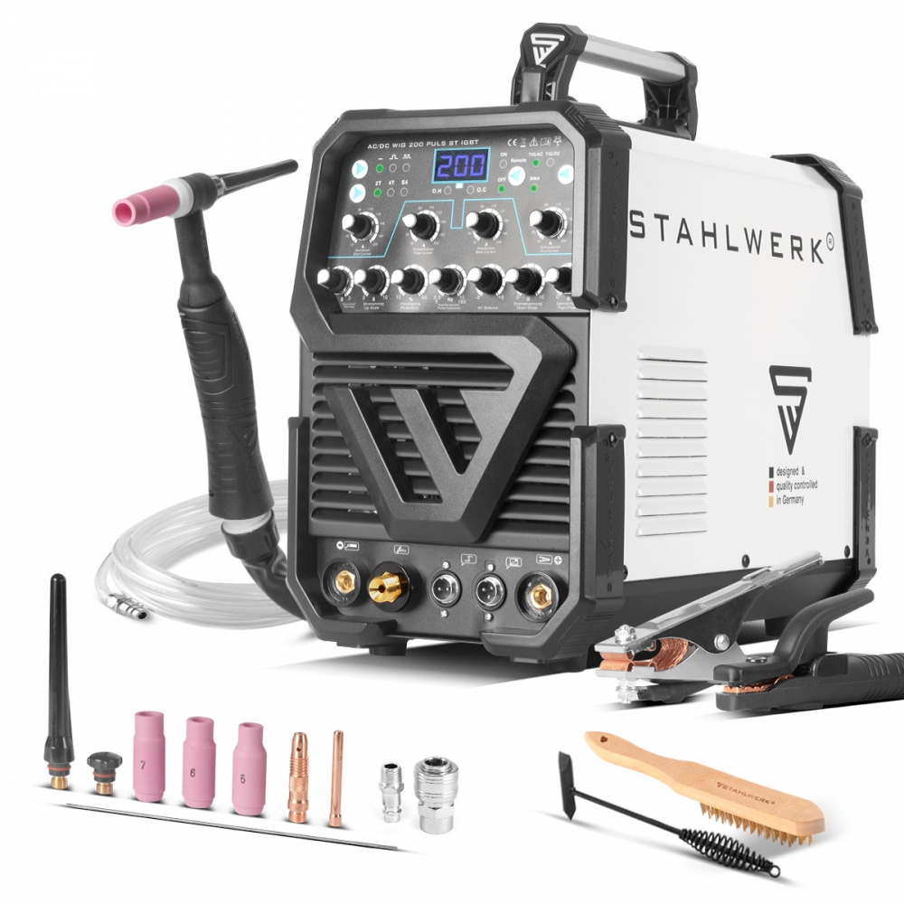 Аппарат STAHLWERK AC/DC TIG 200 Puls ST — это многофункциональный сварочный аппарат TIG с током 200 ампер, с функцией ручной дуговой сварки (MMA) или сварки электродами. Одним из многочисленных преимуществ этого комбинированного сварочного аппарата является компактная конструкция и небольшой вес — всего 13 кг. Аппарат AC/DC TIG 200 Puls ST оснащен расширенной функцией импульсной сварки, которая, помимо прочего, облегчает сварку тонких металлических листов. Такие параметры, как ток импульса, частота импульсов, длинные и короткие импульсы, легко регулируются. Бесконтактное высокочастотное зажигание при сварке TIG обеспечивает комфортную работу и наилучшие результаты сварки. Этот сварочный аппарат оснащен инновационным комплектом шлангов, в который входит горелка TIG WP-26F с гибкой головкой. Горелка WP-26F оснащена кнопкой регулировки сварочного тока и крепится к шлангу с помощью шарового шарнира, что обеспечивает максимальную гибкость процесса сварки TIG.